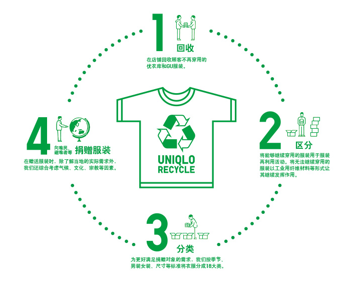 優(yōu)衣庫也有類似的衣物回收舉措:自2007年起,優(yōu)衣庫與已締結(jié)全球合作伙伴關(guān)系的聯(lián)合國難民署(UNHCR)共同攜手,向全世界的難民、流離失所者、災(zāi)民、孕產(chǎn)婦以其他需要幫助的人提供服裝援助。以“將真正優(yōu)質(zhì)的服裝送到全世界所有需要服裝的人手中”為目標(biāo),并采用符合當(dāng)?shù)匦枨蟮男问剑谑澜绶秶粩嗤七M(jìn)服裝捐贈活動。關(guān)于優(yōu)衣庫官網(wǎng)顯示,衣物去向主要是:
